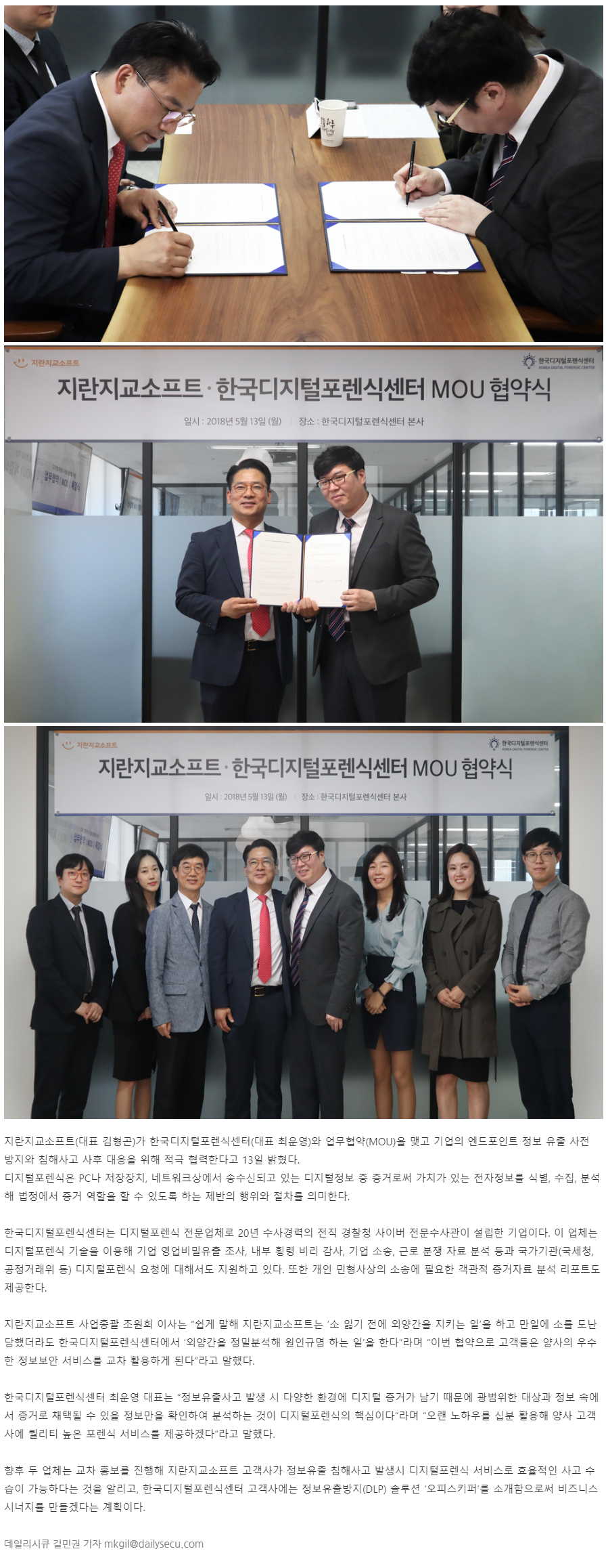 한국디지털포렌식센터ㆍ지란지교소프트 MOU 협약식 진행 - 데일리시큐 한국디지털포렌식센터(주) 2019-07-22 조회 3463 [ 클릭 시 원본 크기로 확인할 수 있습니다 ] 다음글 버닝썬 사건 해결의 KEY! 디지털포렌식, 한국디지털포렌식센터 - tvN 쿨까당 이전글 한국디지털포렌식센터 전유형 기술이사 \"정준영 카톡방 대화 자료, 조작 가능성 없다\" - SBS 8 NEWS 목록으로