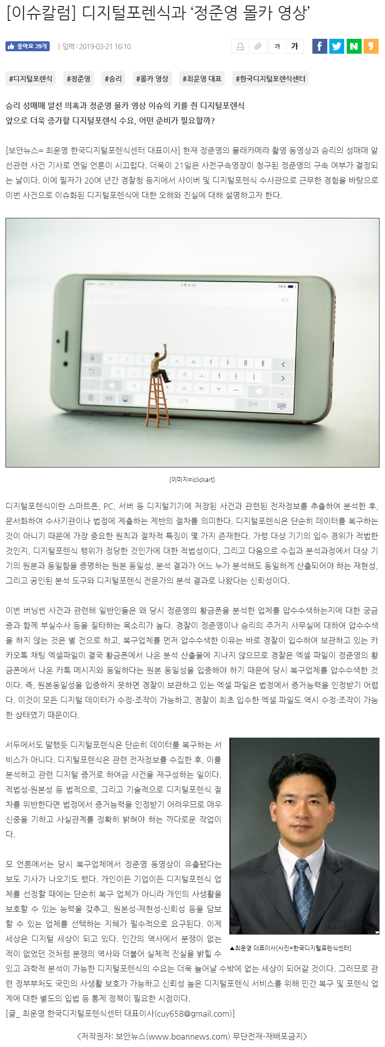 한국디지털포렌식센터 최운영 대표이사 칼럼, 디지털포렌식과 \'정준영 몰카 영상\' - 보안뉴스 한국디지털포렌식센터(주) 2019-07-22 조회 3931 [ 클릭 시 원본 크기로 확인할 수 있습니다 ] 다음글 한국디지털포렌식센터 최운영 대표이사, 서울변호사협회 \'디지털포렌식 활용\' 특강 - 법률신문 이전글 \'이슈추적\' 디지털포렌식이란 무엇인가? - KBS 생방송 아침이좋다 목록으로