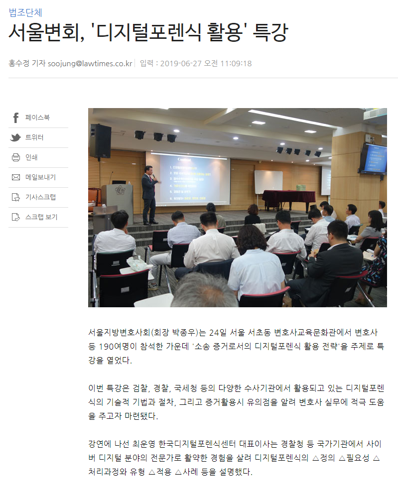 한국디지털포렌식센터 최운영 대표이사, 서울변호사협회 \'디지털포렌식 활용\' 특강 - 법률신문 한국디지털포렌식센터(주) 2019-07-24 조회 3755 [ 클릭 시 원본 크기로 확인할 수 있습니다 ] 다음글 한국디지털포렌식센터 최운영 대표이사, 디지털포렌식 도입으로 투명한 사회 만들기에 일조 - 뉴스토마토 이전글 한국디지털포렌식센터 최운영 대표이사 칼럼, 디지털포렌식과 \'정준영 몰카 영상\' - 보안뉴스 목록으로