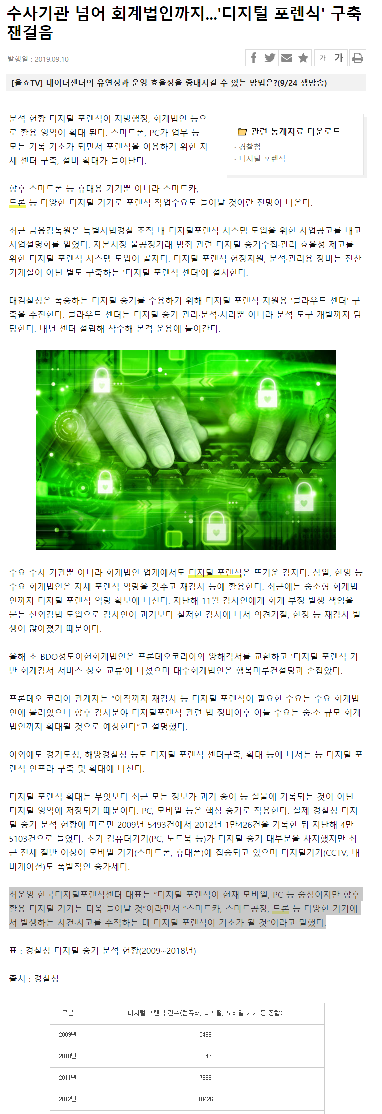 수사기관 넘어 회계법인까지... \'디지털 포렌식\' 구축 잰걸음 - 전자신문 한국디지털포렌식센터 2019-09-18 조회 3602 다음글 한국디지털포렌식센터 “모든 자료가 중요한 증거로 활용될 수 있다” - 문화뉴스 이전글 한국디지털포렌식센터 최운영 대표이사, 사이버수사팀 20년 경력 \'디지털포렌식\' 민간 전도사 - 중기이코노미 목록으로