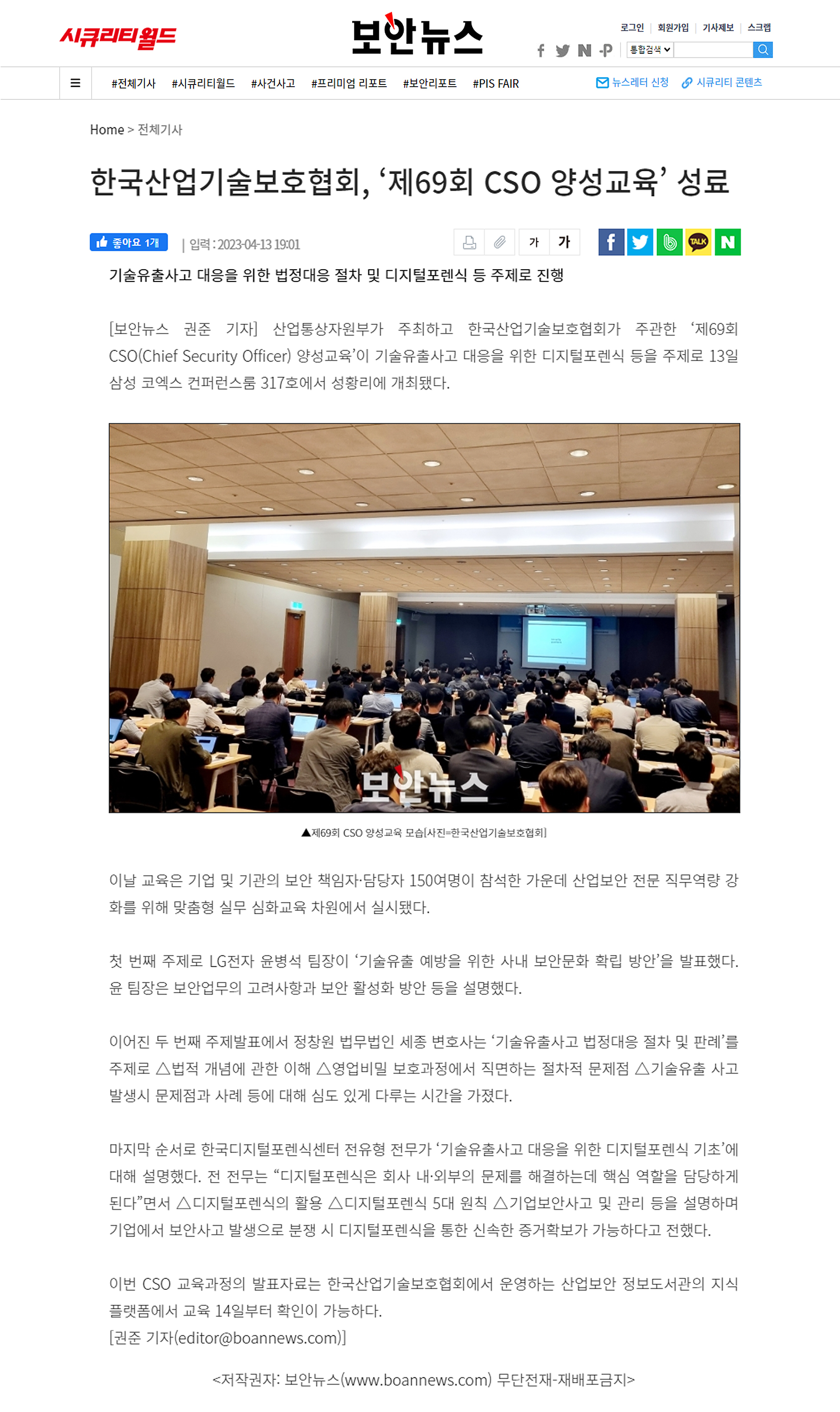 한국산업기술보호협회, ‘제69회 CSO 양성교육’ 성료 - 보안뉴스 한국디지털포렌식센터 2023-07-14 조회 2274 다음글 한국디지털포렌식센터-시큐에버, 상호 교류 및 업무 협력을 위해 업무협약 체결 - 보안뉴스 이전글 한국디지털포렌식산업기술협회, 우한곤 상근부회장 취임 - 보안뉴스 목록으로