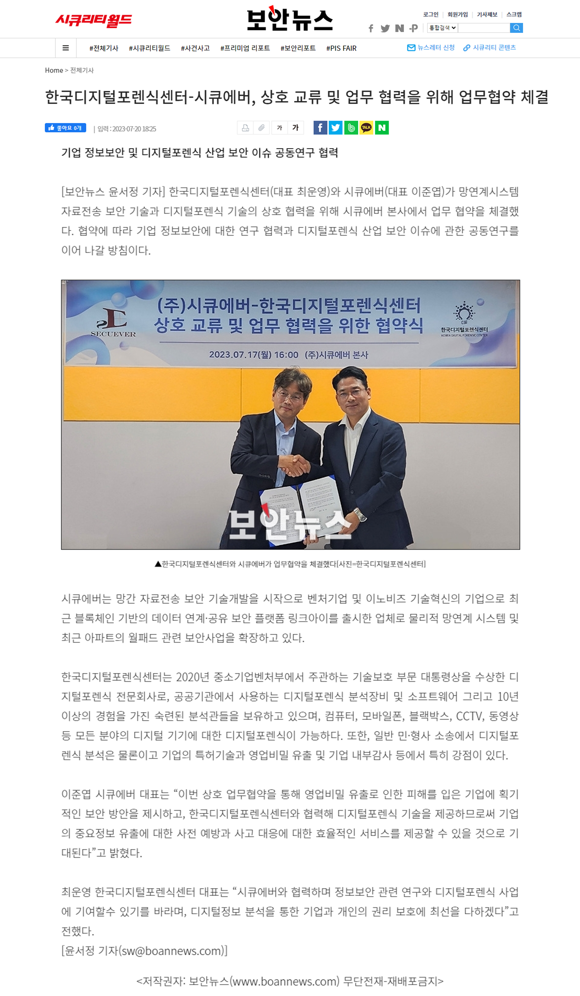 한국디지털포렌식센터-시큐에버, 상호 교류 및 업무 협력을 위해 업무협약 체결 - 보안뉴스 한국디지털포렌식센터 2023-07-21 조회 2084 다음글 법무법인 법승, 한국디지털포렌식센터와 업무협약 체결 - 머니투데이 이전글 한국산업기술보호협회, ‘제69회 CSO 양성교육’ 성료 - 보안뉴스 목록으로