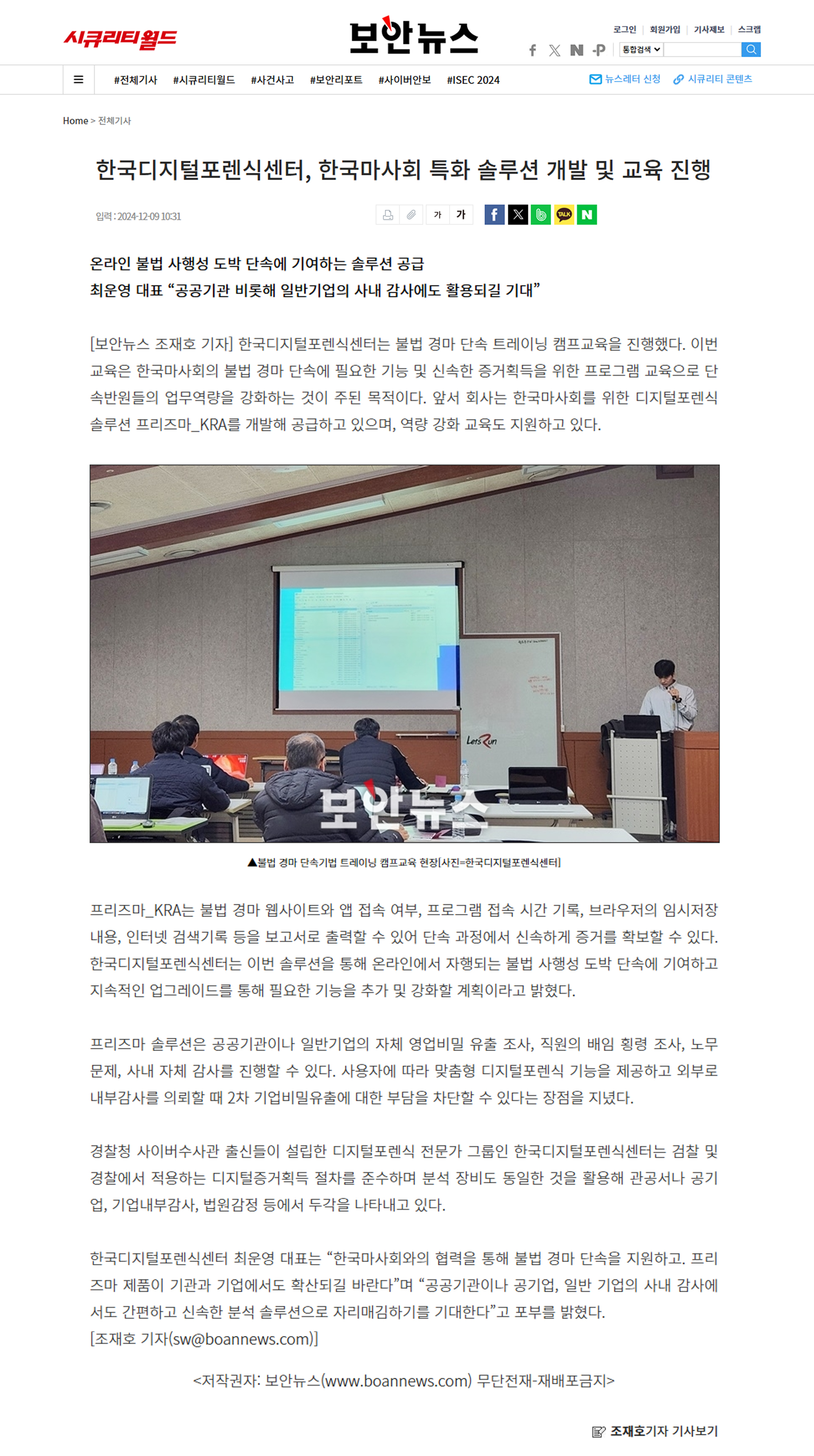 한국디지털포렌식센터, 한국마사회 특화 솔루션 개발 및 교육 진행 - 보안뉴스 한국디지털포렌식센터 2024-12-09 조회 964 다음글 쿠팡 사건 보도에 디지털포렌식 자문 제공…한국디지털포렌식센터, KBS 뉴스 통해 전문성 조명 이전글 법무법인 율재-한국디지털포렌식센터, ‘디지털포렌식’ 업무협약 체결 - 로리더 목록으로