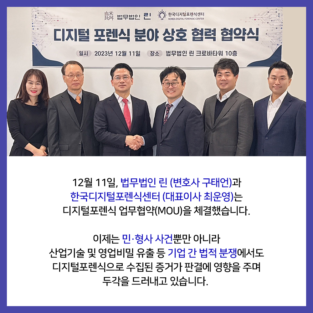 법무법인 린 - 한국디지털포렌식센터, 디지털포렌식 업무협약(MOU) 체결