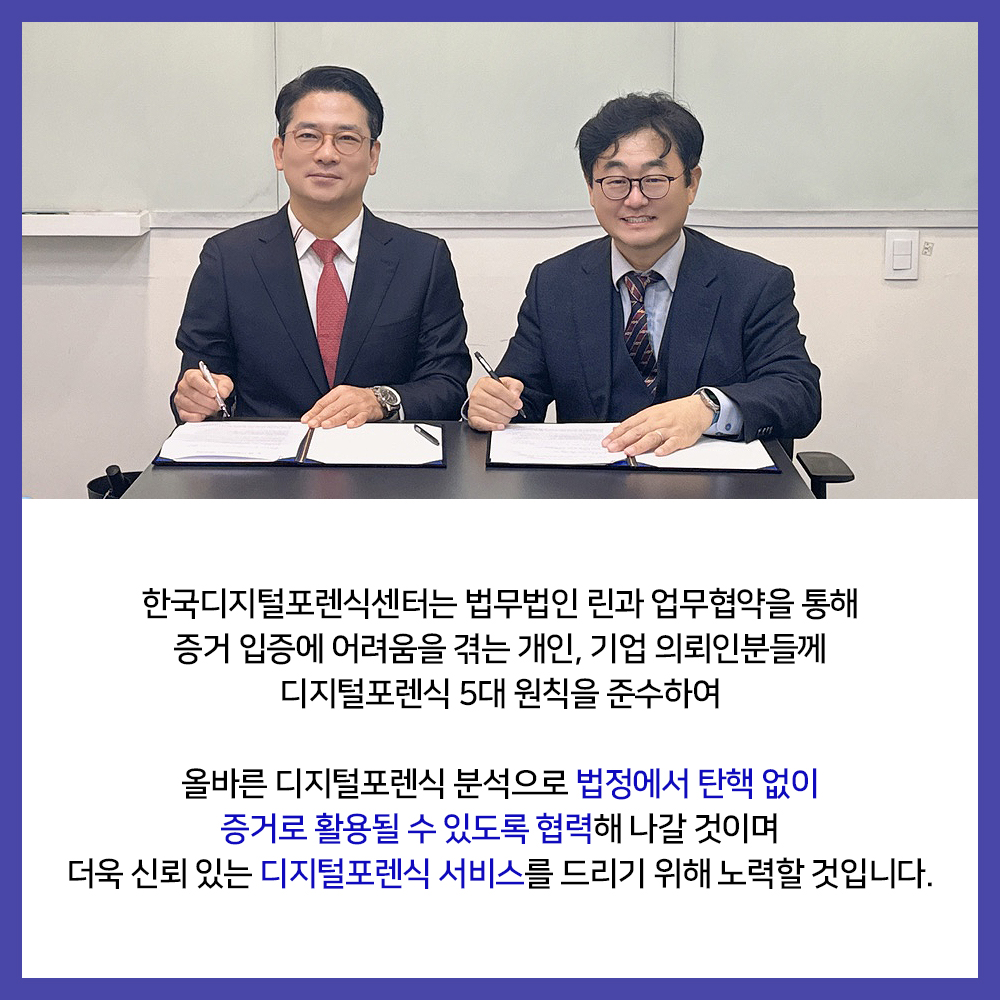 한국디지털포렌식센터 (대표이사 최운영)는 디지털포렌식 업무협약(MOU)을 체결했습니다. 이제는 민·형사