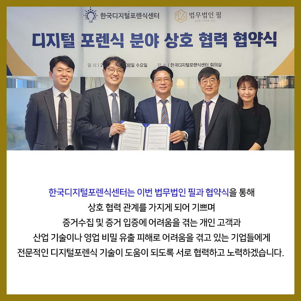 한국디지털포렌식센터는 이번 법무법인 필과 협약식을 통해 상호 협력 관계를 가지게 되어 기쁘며 증거수집 및 증거 입증에 어려움을 겪는 개인 고객과 산업 기술이나 영업 비밀 유출 피해로 어려움을 겪고 있는 기업들에게 전문적인 디지털포렌식 기술이 도움이 되도록 서로 협력하고 노력하겠습니다.