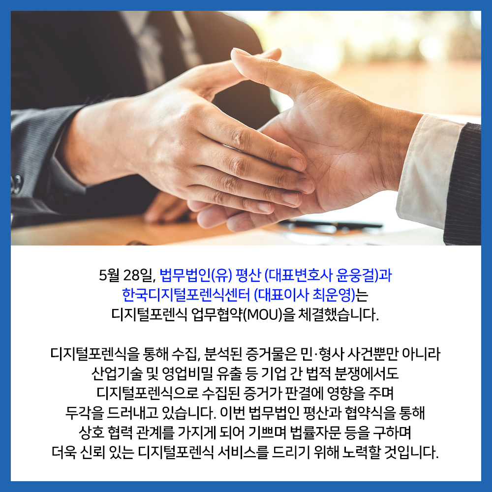 5월 28일, 법무법인(유) 평산 (대표변호사 윤웅걸)과 한국디지털포렌식센터 (대표이사 최운영)는 디지털포렌식 업무협약(MOU)을 체결했습니다. 디지털포렌식을 통해 수집, 분석된 증거물은 민·형사 사건뿐만 아니라 산업기술 및 영업비밀 유출