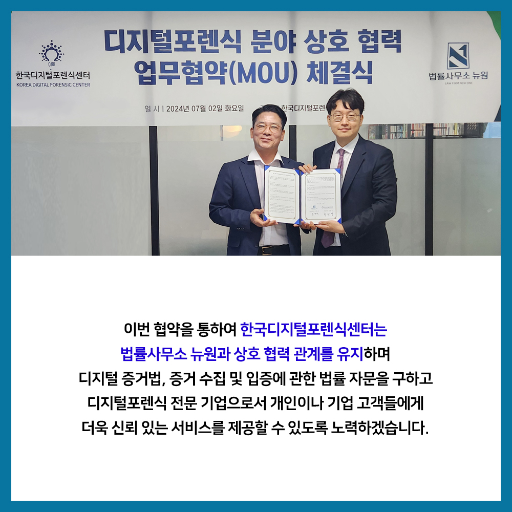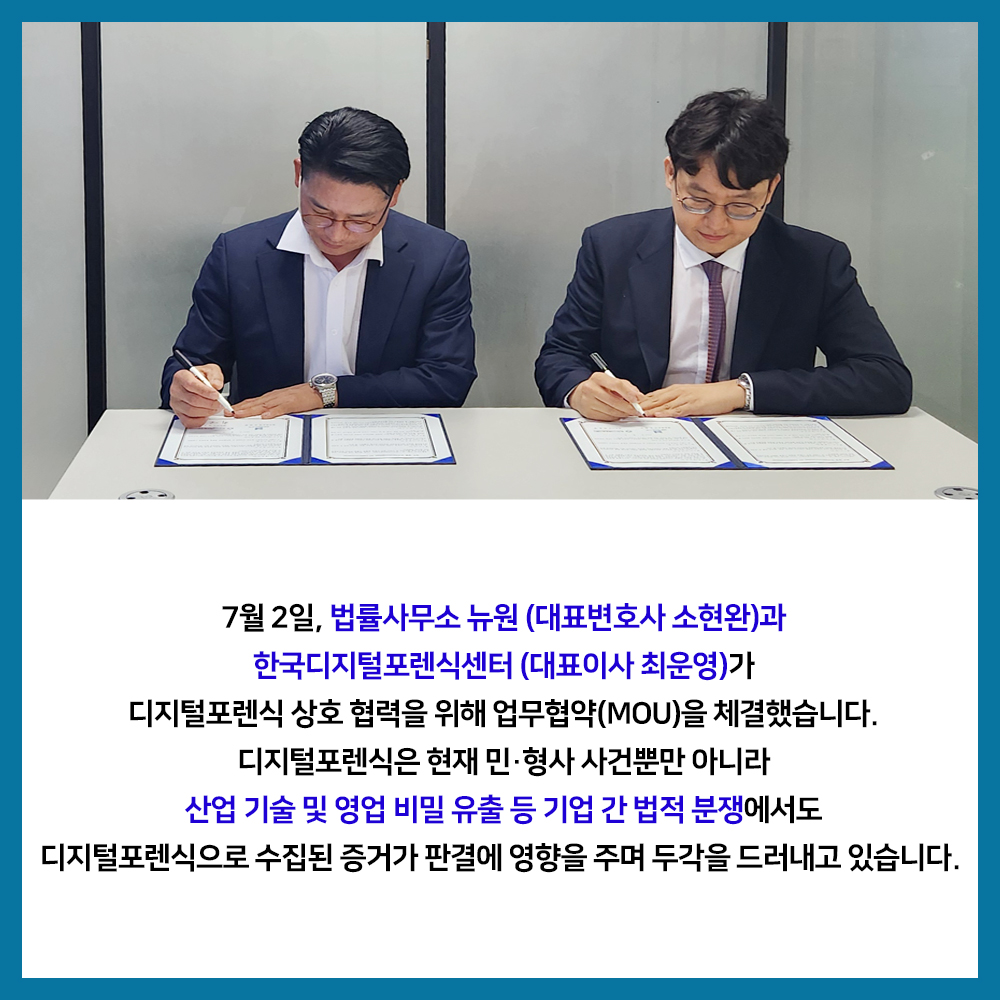 7월 2일, 법률사무소 뉴원 (대표변호사 소현완)과 한국디지털포렌식센터 (대표이사 최운영)가 디지털포렌식 상호 협력을 위해 업무협약(MOU)을 체결했습니다. 디지털포렌식은 현재 민·형사 사건뿐만 아니라 산업 기술 및 영업