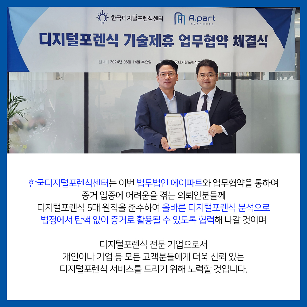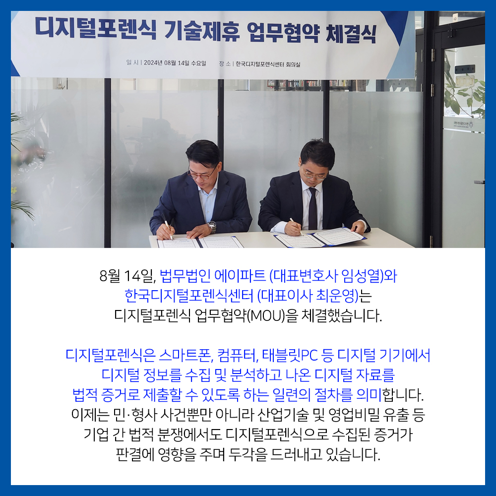 8월 14일, 법무법인 에이파트 (대표변호사 임성열)와 한국디지털포렌식센터 (대표이사 최운영)는 디지털포렌식 업무협약(MOU)을 체결했습니다. 디지털포렌식은 스마트폰, 컴퓨터,