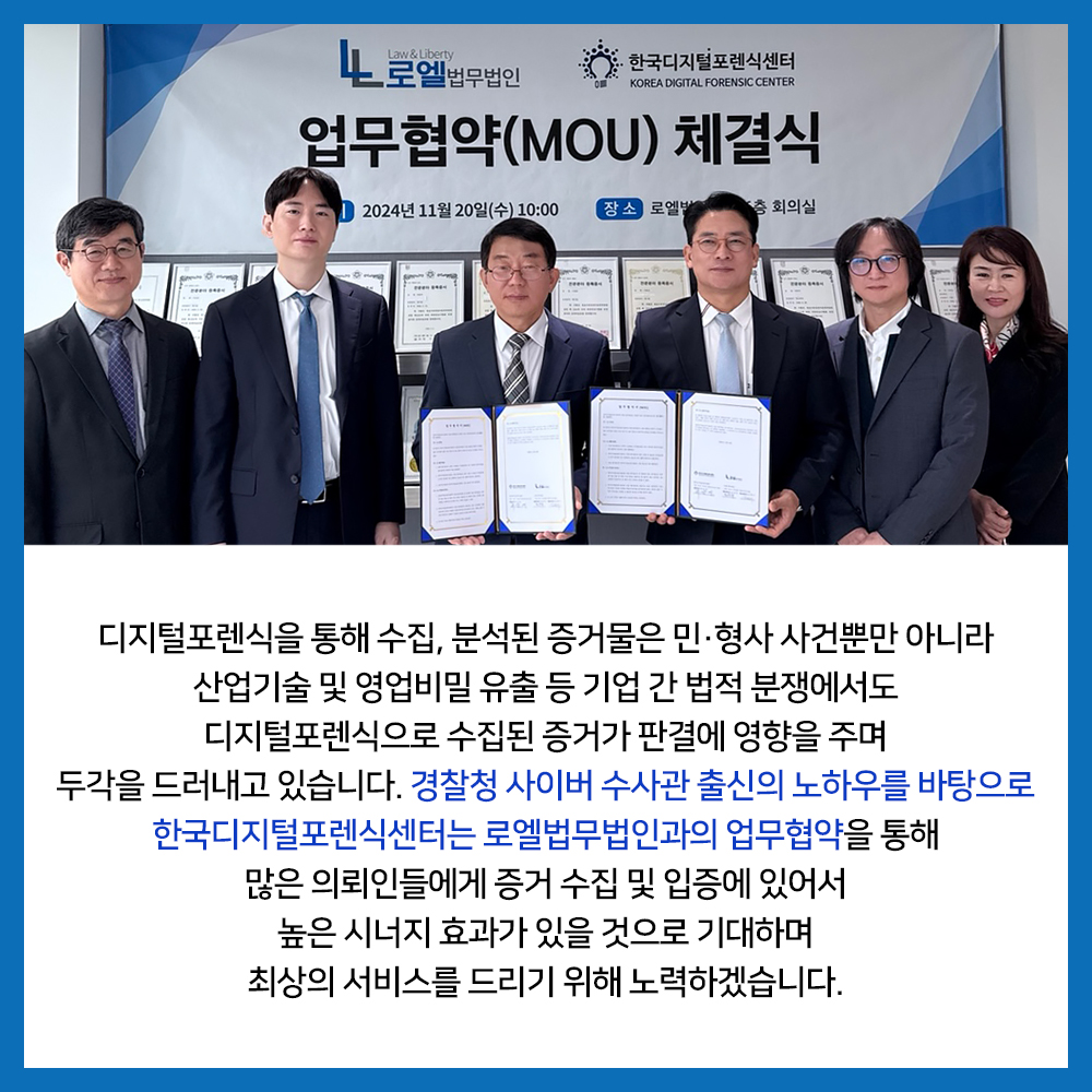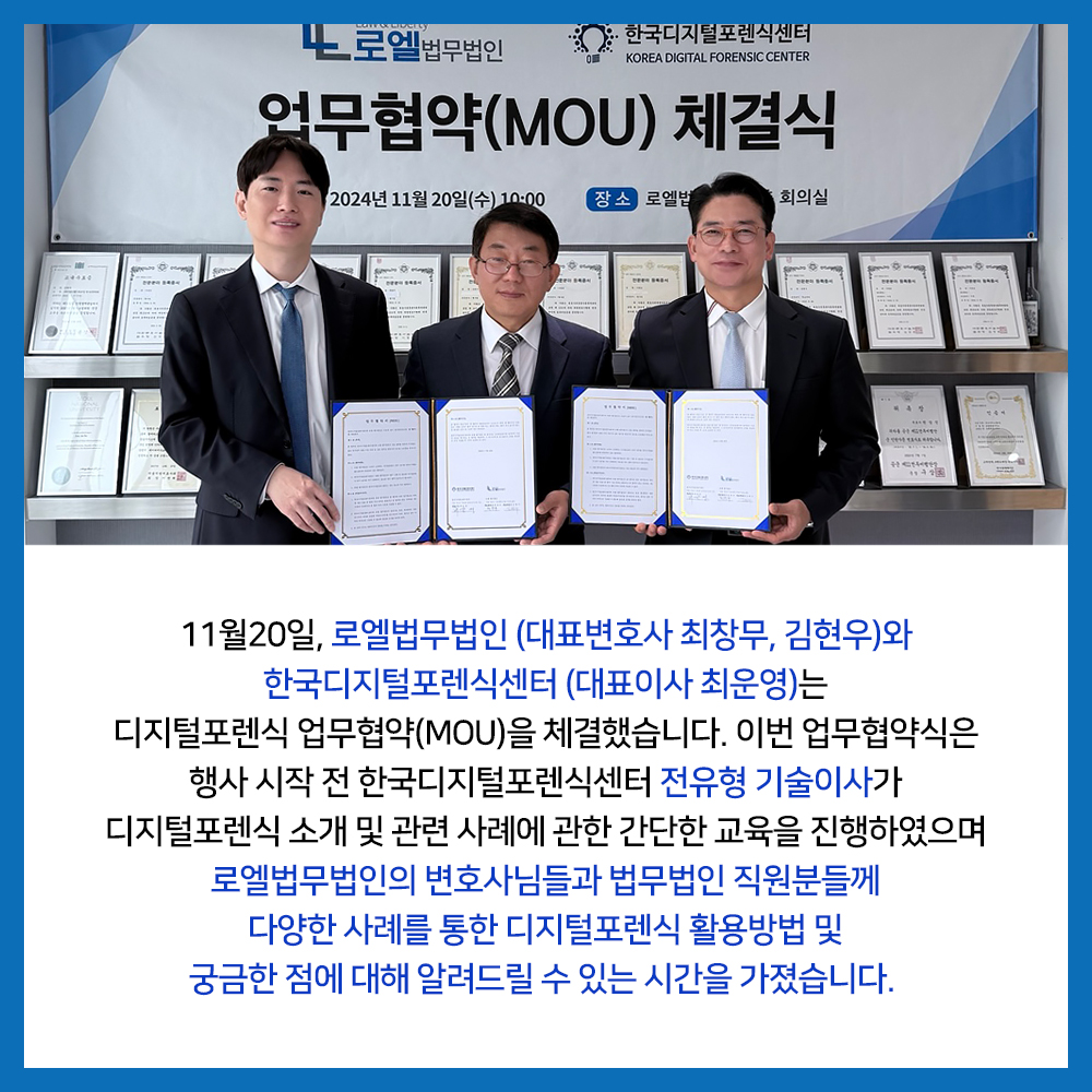 11월 20일, 로엘법무법인 (대표변호사 최창무, 김현우)와 한국디지털포렌식센터 (대표이사 최운영)는 디지털포렌식 업무협약(MOU)을 체결했습니다. 이번 업무협약식은 행사 시작 전 한국디지털포렌식센터 전유형 기술이사가 디지털포렌식 소개 및 관련 사례에 관한 간단한 교육을 진행하였으며 로엘법무법인의 변호사님들과 법무법인 직원분들께 다양한 사례를 통한 디지털포렌식 활용방법 및 궁금한 점에 대해 알려드릴 수 있는 시간을 가졌습니다.
