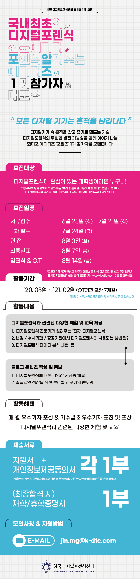 * 정보보호 등 관련학과 지원자 또는 SNS 인플루언서 등에 대한 우대가 있을 수 있으나 디지털포렌식을 알리는 것에 대한 열정이 있는 대학생이라면 누구나 가능합니다.