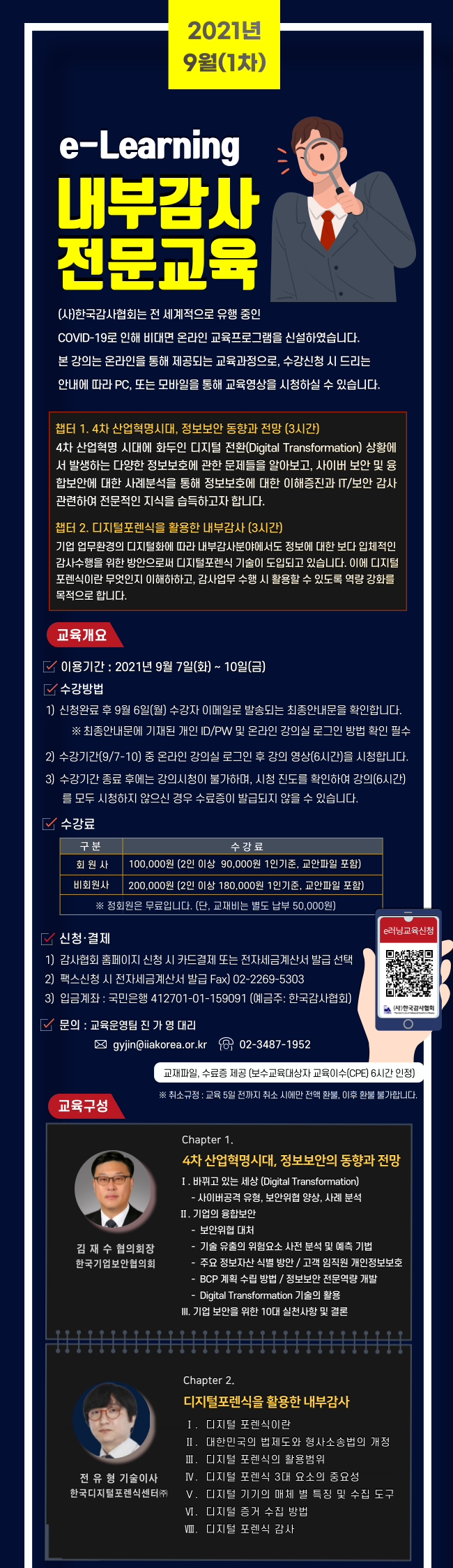 한국감사협회 디지털포렌식을 활용한 내부감사 온라인 강의 한국디지털포렌식센터 2021-08-24 조회 3897 ▼ 신청 바로가기로 연결 ▼https://www.theiia.kr/kr/education/education_list6.php?idx=3546&bgu=view 다음글 디지털포렌식을 활용한 내부감사 e-Learning 강의 진행 완료_(사)한국감사협회 주관 이전글 변호사님들을 위한 디지털포렌식 솔루션상담채널 \'포렌식을 도와주고 알려드리는 도우미가 되겠습니다\' 목록으로