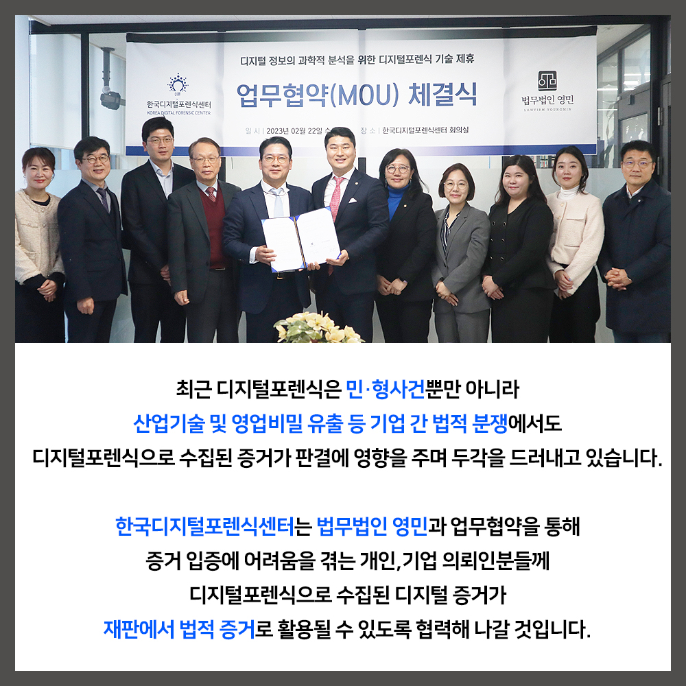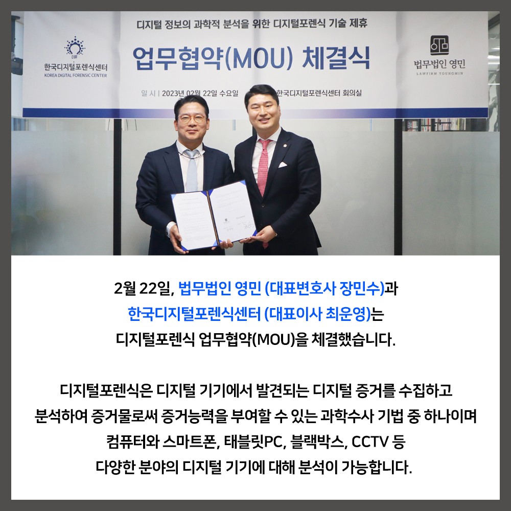 2월 22일, 법무법인 영민 (대표변호사 장민수)과 한국디지털포렌식센터 (대표이사 최운영)는 디지털포렌식 업무협약(MOU)을 체결했습니다.