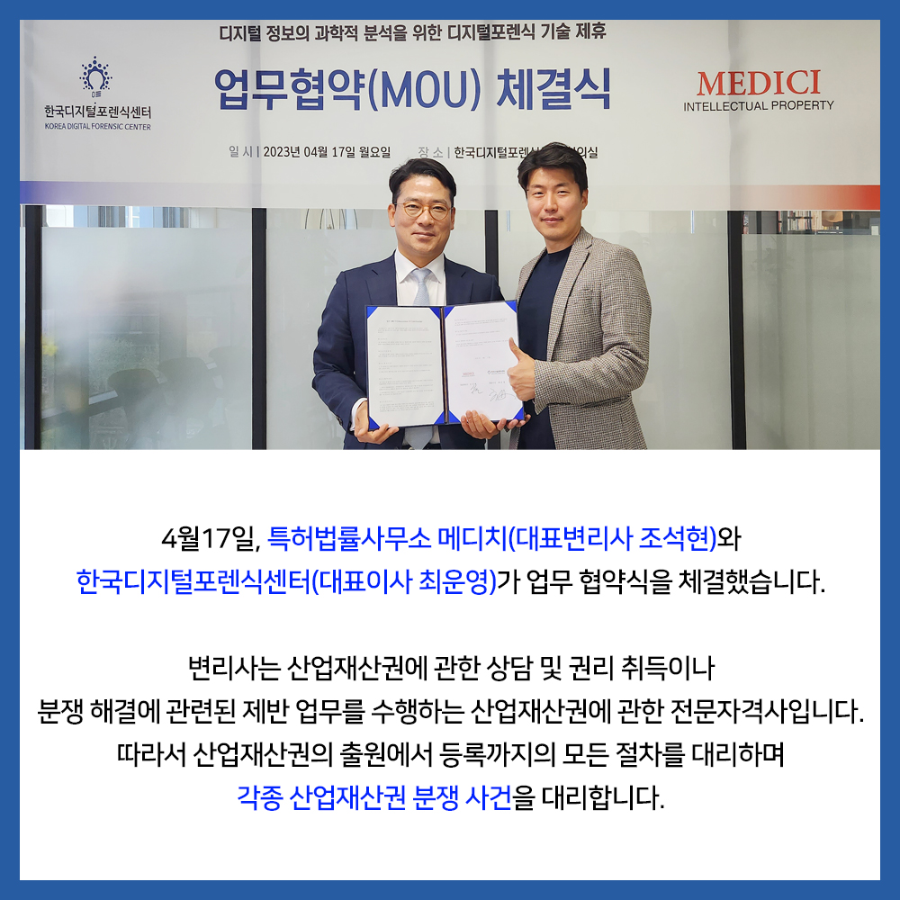 4월17일 특허법률사무소 메디치(대표변리사 조석현)와 한국디지털포렌식센터(대표이사 최운영)가 업무 협약식을 체결했습니다.