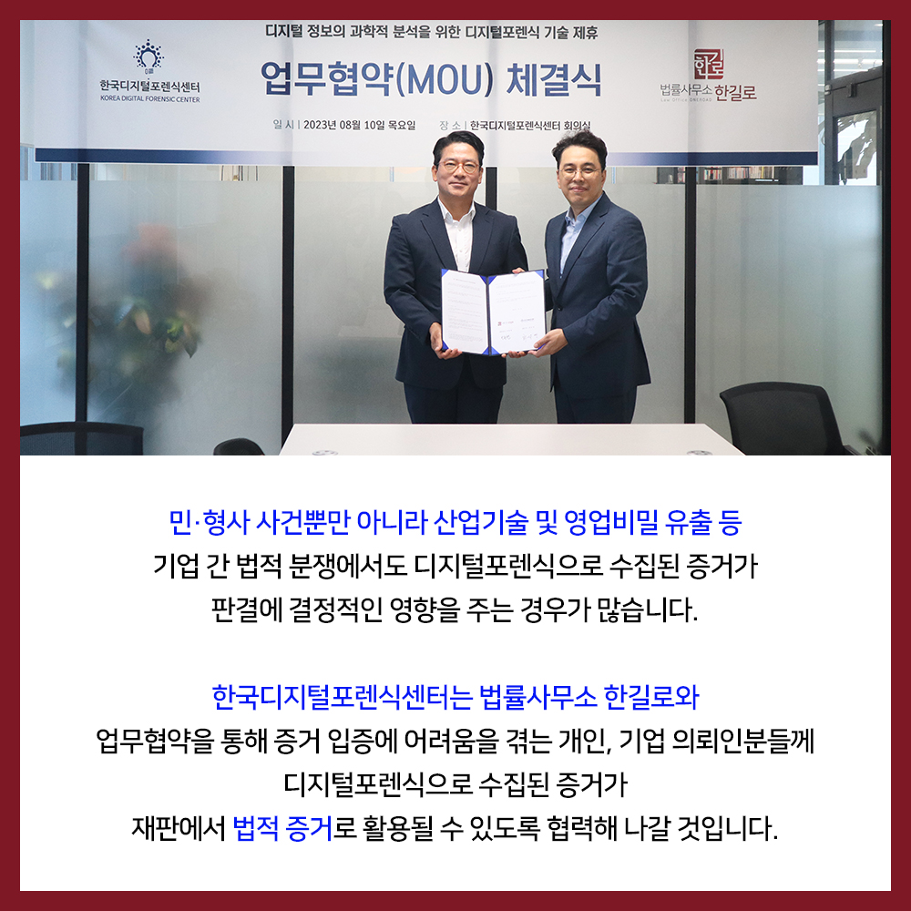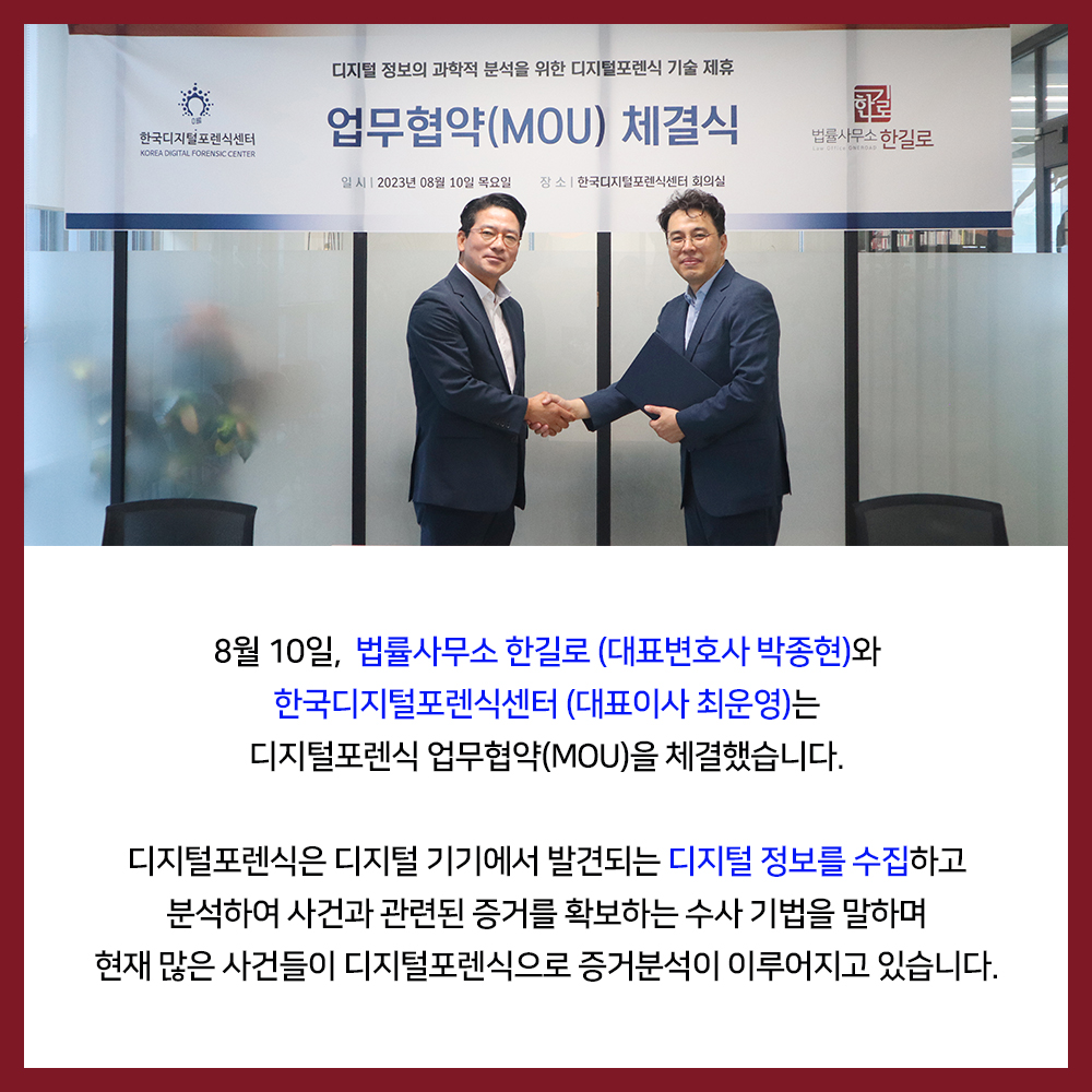 8월 10일, 법률사무소 한길로 (대표변호사 박종현)와 한국디지털포렌식센터 (대표이사 최운영)는 디지털포렌식 업무협약(MOU)을 체결했습니다. 디지털포렌식은 디지털 기기에서 발견되는 디지털 정보를 수집하고 분석하여 사건과 관련된 증거를 확보하는 수사 기법을 말하며 현재 많은 사건들이 디지털포렌식으로 증거분석이 이루어지고 있습니다. 민·형사 사건뿐만 아니라 산업기술 및 영업비밀 유출 등 기업 간 법적 분쟁에서도 디지털포렌식으로 수집된 증거가 판결에 결정적인 영향을 주는 경우가 많습니다. 한국디지털포렌식센터는 법률사무소 한길로와 업무협약을 통해 증거 입증에 어려움을 겪는 개인, 기업 의뢰인분들께 디지털포렌식으로 수집된 증거가 재판에서 법적 증거로 활용될 수 있도록 협력해 나갈 것입니다.